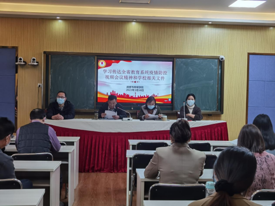 3月18日下午,我院在1210录播教室召开全体教师大会,学习传达全省教育系统疫情防控视频会议精神和学校相关文件。会议由学院党总支副书记李秀林主持,党总支书记岳继勇,院长李萍,副院长梁维东及全体教师同志参加了会议。