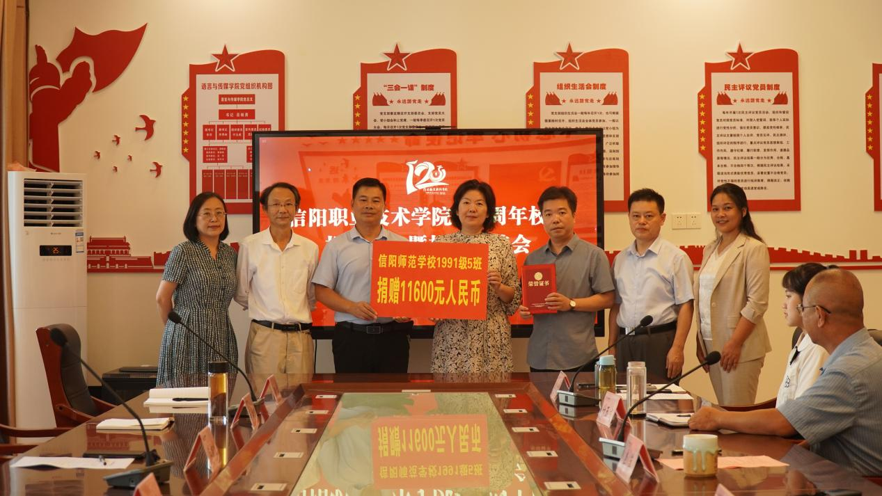 9月15日下午,OK138太阳集团隆重举行原信阳师范学校91级5班向我校120周年校庆捐赠仪式暨校友座谈会。学校党委委员、纪委书记蒋有红,党委办公室主任张国锋,科研处副处长、91级5班班主任张廷远,优秀校友代表张建、徐兵,以及OK138太阳集团教师、学生代表等参加活动。