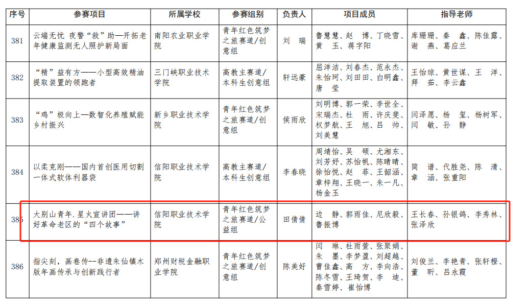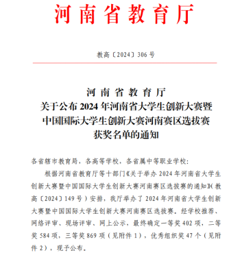 近日,河南省教育厅公布了2024年河南省大学生创新大赛暨中国国际大学生创新大赛河南赛区选拔赛的比赛结果,我院由田倩倩、边静、郭雨佳、尼欣毅、鲁振博五位同学参赛,王长春、孙银鸽等老师指导的创新项目《大别山青年·星火宣讲团—讲好革命老区的“四个故事”》荣获省级二等奖。