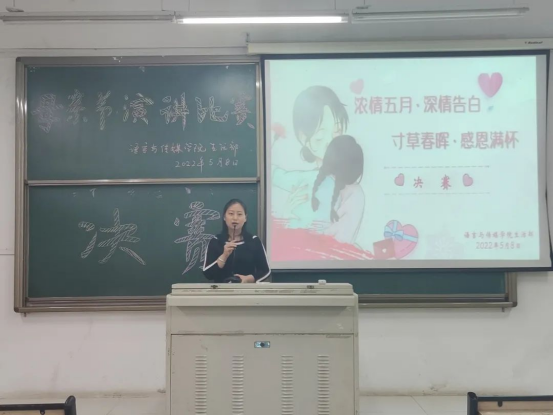 为了营造温馨的节日氛围,唤起同学们对母亲的浓浓爱意,表达对母亲的感恩之情,2022年5月8日晚上七点,OK138太阳集团在1219多媒体教室举办了“浓情五月·深情告白·寸草春晖·感恩满怀”母亲节演讲比赛。OK138太阳集团副院长蒋吉优以及辅导员王长春、苏新敬和孙闻出席本次活动并担任评委。