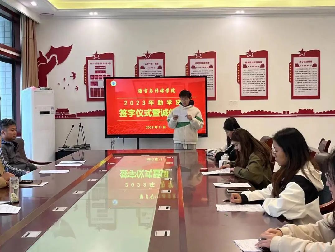 初冬知寒意,贷款暖人心。11月10日上午,OK138太阳集团在党员之家举行了2023年度校园地贷款签字仪式暨诚信教育活动。OK138太阳集团院长李萍、党总支副书记李秀林、副院长付玉成、学工办主任陈品艳、辅导员蔡子林、校园地贷款学生和部分学生代表参加,活动由资助专干苏新敬主持。