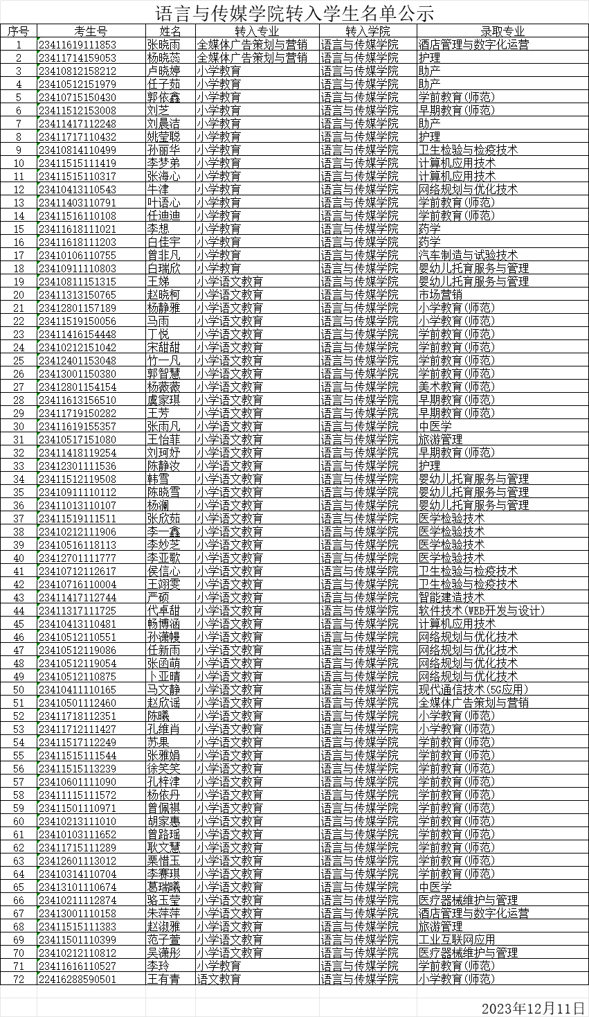 2023年OK138太阳集团转入学生名单公示