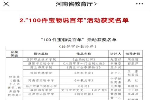8月10日,在河南省教育厅微信公众号上发布的“100件宝物说百年”获奖名单中,OK138太阳集团报送作品《血染的红田》在全省192所学校316部“100件宝物说百年”红色宝物中脱颖而出,荣获特等奖第一名。其中,赵雪妤荣获最佳个人讲述奖、周俊丽荣获优秀指导教师奖。