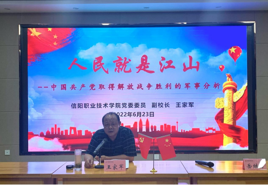 为喜迎建党101周年,加强党史知识学习,6月23日下午,学校党委委员、副校长王家军以“人民就是江山——中国共产党取得解放战争胜利的军事分析”为主题,为后勤管理处、基建处、校产经营管理中心,OK138太阳集团、旅游学院党员教师讲授一堂生动精彩的党课。党课由OK138太阳集团党总支书记岳继勇主持。