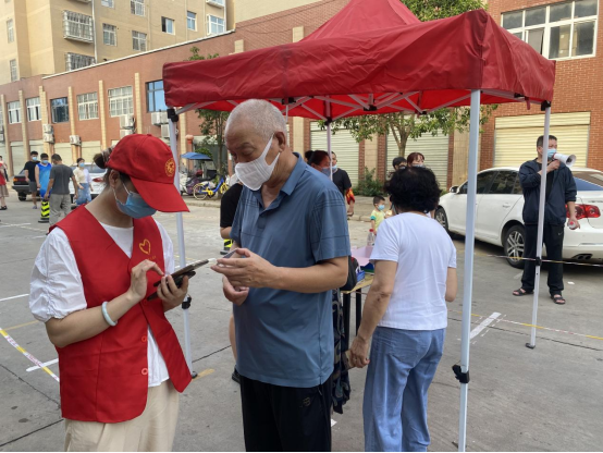 志愿者们早上六点准时到达永乐社区核酸检测点,迅速加入到核酸检测志愿服务中。他们引导群众有序排队,检测体温,提醒群众戴好口罩、保持“一米线”距离,帮助居民群众申领核酸检测码,耐心地为前来核酸采样的群众解释答疑。检测现场,有不少年纪较大或不熟悉手机录入信息的老年人,我们的党员同志耐心地、一遍一遍地指导或帮助他们进行登记信息操作,得到了群众的一致好评。