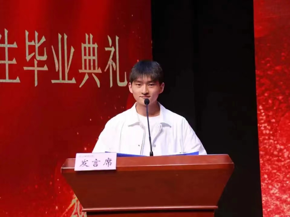 毕业生代表陈相杰发言。他回顾自己大学三年的生活,并分享了自己的学习经历,表达了对老师的感恩,对同窗的不舍,以及对未来的无限憧憬与向往。他祝大家前程似锦,未来可期,一路顺风,万事如意。